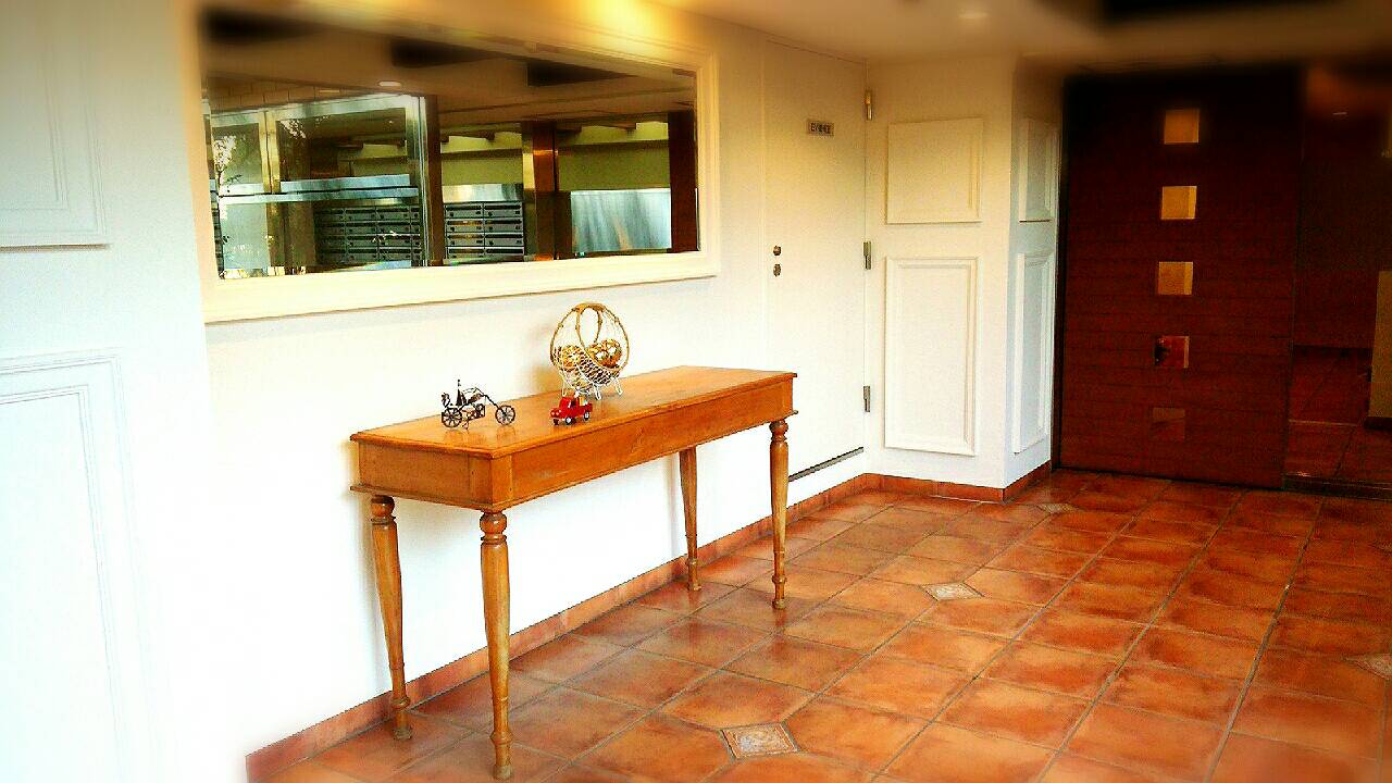 トライダント翠耀館の住人専用の中庭の見えるコリドー。 住人専用の扉の内側には、メールボックス。。 アンティークのデスクにクリスマスの雰囲気。